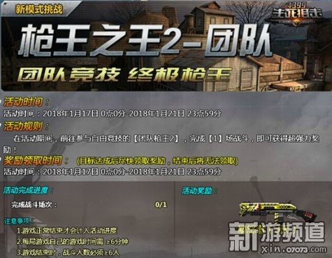 《4399生死狙擊》全新模式槍王之王II上線,你會是《4399生死狙擊》的全能王者嗎?注意了哦,新玩法上線之際,參與挑戰(zhàn)有獎哦。具體活動規(guī)則登錄《4399生死狙擊》游戲,在精彩活動中即可查看。
