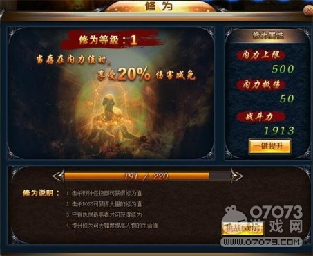 煉體修行,不僅是外功內(nèi)功更要強力才能血戰(zhàn)八方,玩家可以通過擊殺野外BOSS獲得修為值同時提升自己的修為,修為可以提升自己的內(nèi)力上限以及內(nèi)力抵傷,同時能增加玩家的戰(zhàn)斗力,內(nèi)力存在時永遠有百分比減傷,讓怪物和玩家都打不動你!