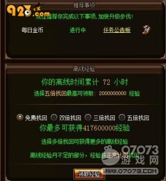 登錄923yx《烈火戰(zhàn)神》,系統(tǒng)就會自動彈出戰(zhàn)神福利界面,大家可在該界面領(lǐng)取離線經(jīng)驗。離線經(jīng)驗可以使用道具多倍領(lǐng)取,大家可根據(jù)自身需求來選擇領(lǐng)取多倍經(jīng)驗值。不過需要注意的是,離線經(jīng)驗最多可累計72小時,超過的部分將不計算離線時長。