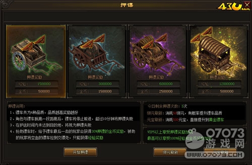 玩家每天可以押鏢3次,如果對當前的鏢車品質不滿意,可以消耗50綁元來刷新鏢車的品質,消耗500元寶可以直接提升到黃金鏢車哦!當角色與鏢車脫離一段距離后,鏢車將會停止前進,如果超過10分鐘就會面臨押鏢失敗。