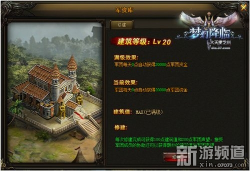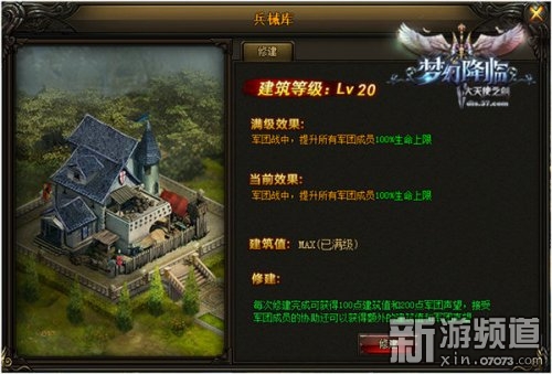 37《大天使之劍》兵械庫是存放軍團裝備物資的地方,修建兵械庫可以極大的強化玩家在軍團戰(zhàn)中生存能力。在軍團戰(zhàn)中,已經(jīng)建造兵械庫的軍團的軍團成員可以獲得5%-100%的生命上限加成,兵械庫的等級越高,獲得的加成越高。