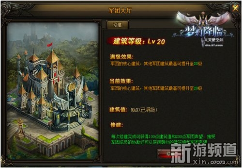 37《大天使之劍》的軍團大廳是所有軍團建筑立面最重要的建筑,因為軍團大廳的等級限制了其他軍團建筑最高可建筑的等級,所以在修建軍團建筑時,必須優(yōu)先修建軍團大廳,軍團大廳最高可升級至20級。