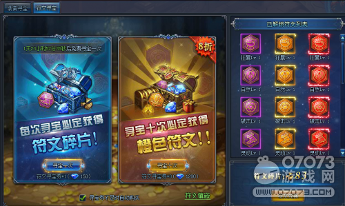 符文尋寶,符文尋寶同樣是花費鉆石進行尋寶,每抽取10次必定獲得橙色品質(zhì)的符文,每次尋寶可獲得一定數(shù)量的符文碎片,玩家可通過符文碎片兌換自己心儀的符文。每日可免費進行一次尋寶。