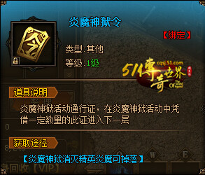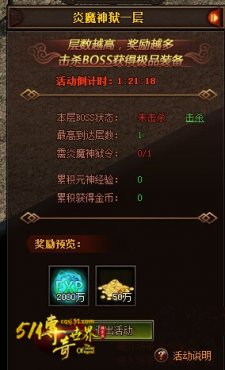 炎魔神獄面板可以看到本層BOSS是否被擊殺、目前到達(dá)層數(shù)、進(jìn)入下一層需要的炎魔令、累積獲得的元神經(jīng)驗(yàn)和金幣。炎魔神獄刷新的是全地圖的高級BOSS,易擊殺,掉落全職業(yè)極品裝備和副本卷軸。每一層都有BOSS,先到先得,同時以魔神獄令為通行證,每一層都需要一定數(shù)額的魔神獄令才能進(jìn)入,可以擊殺炎魔精英來獲得,基本是必爆一個令牌。