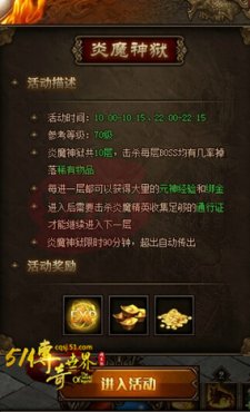 51《傳奇世界》炎魔神獄是定時開啟的活動,進(jìn)入炎魔神獄玩家可以擊殺BOSS通關(guān)奪寶,擊殺每層BOSS可以獲得大量的經(jīng)驗(yàn)和綁金,還有幾率掉落稀有物品,快跟小編一起來了解下51《傳奇世界》炎魔神獄的玩法吧!
