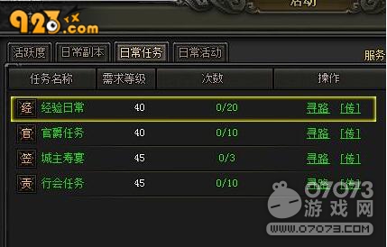經(jīng)驗日常每天可以完成20次,完成后可獲得大量經(jīng)驗獎勵。官爵任務(wù)每天可接受10次,完成任務(wù)獲得大量的官爵值獎勵。城主壽宴45級以上的玩家每天可領(lǐng)取3次,每天的15:00-15:30和21:15-21:45為雙倍賀壽時間,期間完成任務(wù)可獲得雙倍獎勵。行會任務(wù)每天可完成10次,完成任務(wù)可獲得行會資源和行會貢獻(xiàn)。