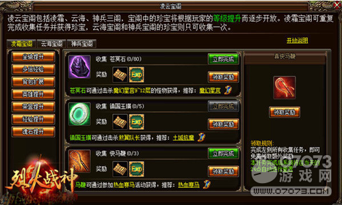 蘿卜玩《烈火戰(zhàn)神》中的凌云寶閣同時又分凌霜、云海、神兵、天威四大寶閣,寶閣中的珍寶將根據(jù)玩家的等級提升而漸漸開放。凌霜和天威寶閣可重復(fù)完成收集任務(wù)并獲得珍寶,而海寶閣和神兵寶閣的珍寶則只可收集。只要你每天花一定的時間,收集一定數(shù)量的指定物品上交到凌云寶閣即可獲得裝備、翅膀、足跡、幻武等珍貴物品,使你的戰(zhàn)力迅速提升。