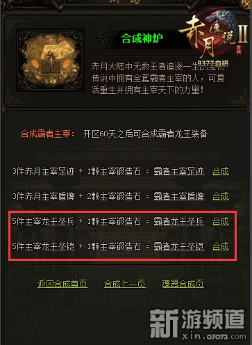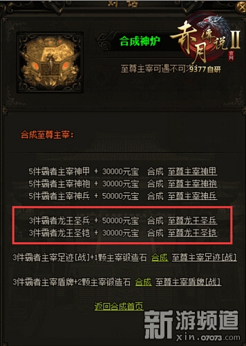 至尊龍王圣裝合成將在9377《赤月傳說(shuō)2》開(kāi)服90天之后在神爐處開(kāi)放。在9377《赤月傳說(shuō)2》合成神爐處,至尊龍王圣兵由3件霸者龍王圣兵加50000元寶合成;至尊龍王圣鎧則用3件霸者龍王圣鎧加30000元寶合成。