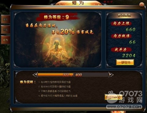 有了伴侶助陣,自身能力的提升也不能忽略。除了必備的技能外,修為的增長可帶來屬性的提升,包括內力上限、內力抵傷等,那么修為如何才能獲得呢?很簡單,玩家只要擊殺野外怪物即可獲得修為值,擊殺BOSS更可獲得大量的修為值,提升修為后可大幅提高自身的生命值。