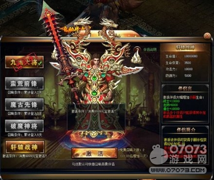 1k2k《皇城戰(zhàn)》中的你并不是一個人在戰(zhàn)斗,可召喚伴侶與你并肩作戰(zhàn),九幽大將、蠻荒前鋒、魔古先鋒、破魔神將、軒轅戰(zhàn)神都是你的選擇,不過必須達到各伴侶召喚的條件才行。其中九幽大將每天會給予大家免費召喚次數,當累計登錄天數達到2天、3天、5天,則可分別召喚蠻荒前鋒、魔古先鋒、破魔神將。軒轅戰(zhàn)神最給力,激活條件自然也就自苛刻,需消費9999元寶方可激活。