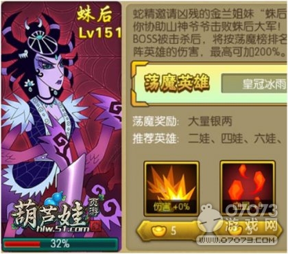 不知道葫蘆娃的故事大家還記得多少,兩個為禍人間的妖怪與七只葫蘆娃的事跡,是否還讓你們激情滿滿,別急,接下來就和小編一起來51《葫蘆娃》尋找童年最真切的回憶!要說什么是最激動人心的,當然得屬七兄弟大戰(zhàn)蛇精,然而這一次蛇精邀請了兇殘的金蘭姐妹“蛛后”,趕緊拿上屬于各位葫蘆娃的法寶,一起來挑戰(zhàn)蕩魔,蕩魔可挑戰(zhàn)三次,每日重置次數(shù),每周一重置蛛后血量,如果提前殺死蛛后,則重置蛛后血量前無法再次挑戰(zhàn);讓你協(xié)助山神爺爺擊敗蛛后大軍,boss被擊殺后,將按蕩魔榜排名英雄的傷害,最高可加200%。
