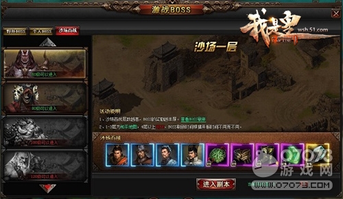 進(jìn)入51《我是皇》中,眾多BOSS等著你前去挑戰(zhàn),在激戰(zhàn)BOSS界面你可以選擇野外BOSS、個(gè)人BOSS以及沙城百戰(zhàn)。游戲中每天會(huì)定時(shí)出現(xiàn)世界BOSS,你可與全服玩家一同擊殺,可掉落極品裝備獎(jiǎng)勵(lì),及各種稀有道具。此外,擊殺BOSS還可以獲得BOSS之魂,可用于激活對(duì)應(yīng)的名將錄,且BOSS之魂大概率掉落,激活后可以提升屬性。