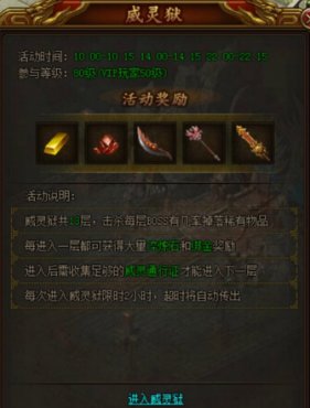 屠龍榮耀中,玩家進入威靈獄會獲得大量淬煉石和綁金,并掉落豐厚的武器裝備,有了這些日后挑戰(zhàn)難度更高的關卡也是有底氣的,玩家可通過武城的威靈獄使者進入,也可在活動界面直接進入。威靈獄只在固定時間開啟,并限時關閉。