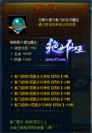 在37《絕世仙王》BOSS副本中,玩家只有通過佩刀的絕世攻擊技能才能對絕世BOSS造成傷害,擊殺絕世BOSS可以獲得更多高級裝備,并且絕世BOSS只有在絕世攻擊技能傷害足夠高才能被擊敗,游戲中的精鐵、寒鐵、隕鐵等鐵石是能額外提升佩刀的屬性。