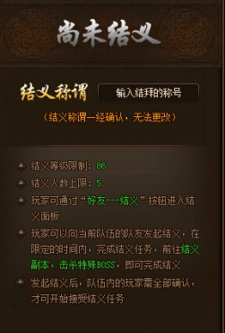 結(jié)義系統(tǒng)在好友界面可以看到,結(jié)義等級為86級以上,結(jié)義人數(shù)上限是5人。玩家可以向當(dāng)前隊(duì)伍的隊(duì)友發(fā)起結(jié)義,在限定的時(shí)間內(nèi),完成結(jié)義任務(wù),前往結(jié)義副本,并擊殺特殊boss,即可完成結(jié)義。