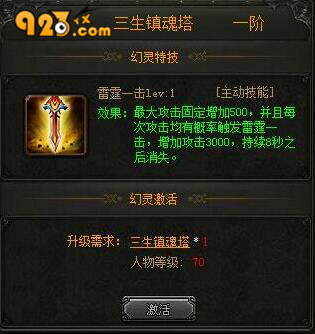 三生鎮(zhèn)魂塔是一種極品幻靈,激活三生鎮(zhèn)魂塔,最大固定攻擊增加500,并且每一次攻擊有一定的概率觸發(fā)雷霆一擊,短時(shí)間內(nèi)增加大量攻擊力。而要想擁有三生鎮(zhèn)魂塔,目前只有一種方式,那就是尋寶!