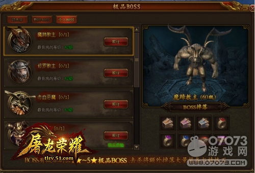在51《屠龍榮耀》中,隨著人類對怪物的認知加深,為了更好得記住怪物的特點,并且方便在人們之間流傳,冒險者們根據自己擊殺的怪物繪畫出了BOSS圖鑒。細心研究這些圖鑒,人們可以了解到BOSS對應的技能、戰(zhàn)斗方式、弱點等信息。玩家可以通過點擊主界面的boss圖鑒進入界面,讀取各個boss的戰(zhàn)斗數據。激戰(zhàn)BOSS界面分為三個頁簽,每個頁簽中有玩家可擊殺BOSS供選擇,玩家根據自身情況挑戰(zhàn)任意一只BOSS,從中獲得豐厚的裝備獎勵。