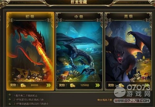 華天龍《亞瑟神劍》巨龍寶藏,擊敗寶藏守護(hù)巨龍,贏取大量獎(jiǎng)勵(lì),巨龍寶藏分為初級(jí),中級(jí),高級(jí)三個(gè)級(jí)別,等級(jí)越高獲得的獎(jiǎng)勵(lì)越多,玩家每日可以挑戰(zhàn)兩次,大量金幣等你來拿,提高自己的實(shí)力讓你輕松挑戰(zhàn)高級(jí)巨龍!