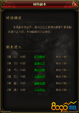 材料副本包括礦洞遺跡、諸神大廳、寒冰洞窟、水晶地牢、幽暗秘境與火焰祭壇。每個副本玩家每天可進(jìn)入2次,由于難度系數(shù)的不同,對應(yīng)的玩家進(jìn)入等級也不同。材料副本每日0點(diǎn)會重置進(jìn)入次數(shù),如果你想每天擁有更多通關(guān)副本的機(jī)會而不浪費(fèi),就要在0點(diǎn)刷新之前用完當(dāng)前進(jìn)入次數(shù)哦。