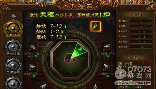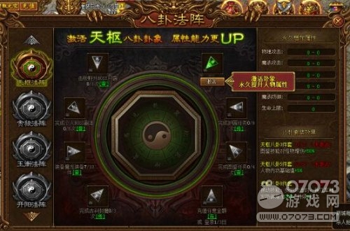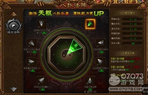 打開界面,我們看到右側(cè)八卦圖標(biāo),點(diǎn)擊進(jìn)入便可看到流傳于后世的八卦陣法。傲天金裝傳奇八卦陣法分為了天樞、貪婪、玉衡、開陽、瑤光五大法陣。每一重法陣需要激活八大卦象,不同的卦象需要不同的任務(wù)來滿足條件激活。“激活天樞八卦卦象,屬性能力更UP。”也許這就是它稱雄江湖的廣告語。別看廣告,看效果!傳說,激活卦象將永久提升人物屬性。我們就先來對天樞法陣一試,目前小編已經(jīng)完成其中一個任務(wù),可以激活其中一個卦象。