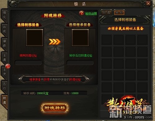 附魂轉(zhuǎn)移的條件是,轉(zhuǎn)移裝備需要擁有附魂經(jīng)驗(yàn),并在5轉(zhuǎn)以上,滿足這兩個(gè)條件就可以花費(fèi)2888元寶,讓繼承裝備將獲得所有轉(zhuǎn)移裝備的附魂經(jīng)驗(yàn),成功轉(zhuǎn)移附魂。