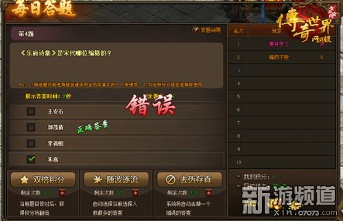 為了幫助大家過(guò)年時(shí)能完美回答親朋好友的提問(wèn),貪玩《傳奇世界》網(wǎng)頁(yè)版新增了每日答題日?;顒?dòng),讓大家開(kāi)動(dòng)腦筋,活躍下思維,參與答題可獲得積分排名獎(jiǎng)勵(lì),活動(dòng)結(jié)束后通過(guò)郵件發(fā)放。排名第一的還有特殊稱號(hào)。