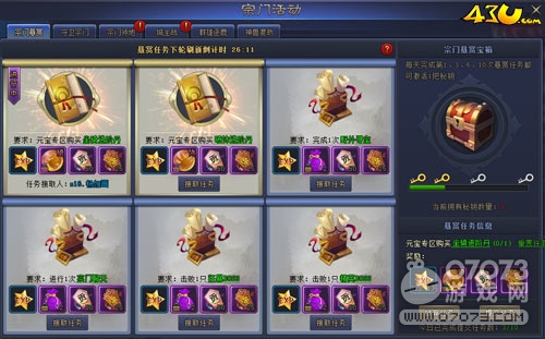 在43u《鴻蒙天尊》中,達(dá)到90級并且加入宗門九可以到宗門活動接取宗門懸賞任務(wù)啦!宗門任務(wù)可是各具特色,像購買神兵進(jìn)階丹、升級靈寶、擊敗1只精英BOSS、靈寵技能升級、天書升級、裝備強(qiáng)化,這些任務(wù)其實都很簡單,但是任務(wù)刷新需要時間,小伙伴們妖耐心等待哦!