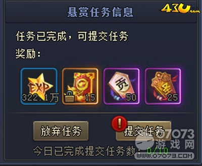 玩家每天可以完成10次懸賞任務(wù),每輪的任務(wù)位6個,當(dāng)本輪的任務(wù)全部提交后,將會減少20分鐘的刷新等待時間,懸賞任務(wù)自動刷新時,將會重置所有沒有提交的任務(wù),所以小伙伴們完成任務(wù)后要記得及時提交哦!如果想放棄任務(wù)那么需要5分鐘后采可以接取其他新的任務(wù)哦!