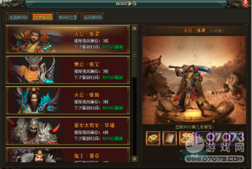 在《我在三國(guó)》里有著各種強(qiáng)大的BOSS分布在各個(gè)地圖,點(diǎn)擊右上方的“BOSS” 就能快速的查詢(xún)各雷霆戰(zhàn)將BOSS的狀況和掉落物品。
