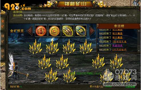 在923yx《戰(zhàn)天》中有一個“神秘礦山”活動,里面有銅礦、銀礦和金礦可以挖取。活動期間,每提取1000元寶即可獲得1個礦鋤,可在界面中挖礦獲得獎勵。在神秘礦山的銅礦、銀礦和金礦中金礦的獎勵最好,有較高的幾率可以獲得極品道具。