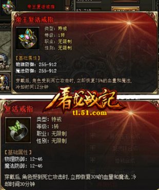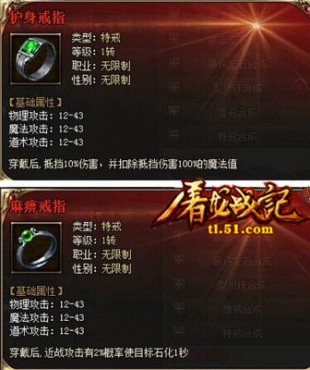 屠龍戰(zhàn)記戰(zhàn)士職業(yè)可佩帶麻痹戒指、復(fù)活戒指;法師職業(yè)可佩帶護(hù)身戒指、復(fù)活戒指;道士可佩帶護(hù)身戒指和復(fù)活戒指。復(fù)活戒指:玩家穿戴后,角色受到死亡攻擊時(shí),立刻恢復(fù)30%的血量和魔法,冷卻時(shí)間30分鐘;麻痹戒指:穿戴后,近戰(zhàn)攻擊有2%概率使目標(biāo)石化1秒;護(hù)身戒指:穿戴后,抵擋10%傷害,并扣除抵擋傷害100%的魔法值。