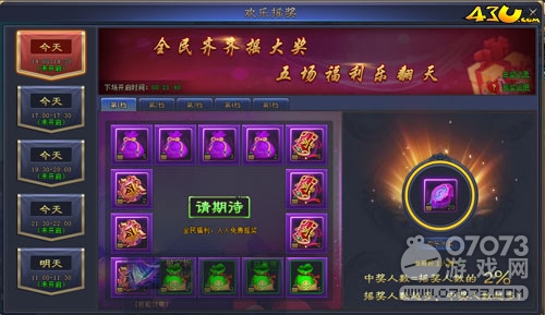 全民福利,人人免費(fèi)搖獎(jiǎng)。參與43u《鴻蒙天尊》歡樂搖獎(jiǎng)就可立即獲得一份隨機(jī)搖獎(jiǎng)大禮,搖獎(jiǎng)結(jié)束后系統(tǒng)獎(jiǎng)進(jìn)行開獎(jiǎng),參與搖獎(jiǎng)的仙友均可有機(jī)會(huì)獲得對(duì)應(yīng)的歡樂大獎(jiǎng),另外花費(fèi)10元寶購買福袋送抽獎(jiǎng)一次,花費(fèi)50元寶購買福盒送抽獎(jiǎng)一次哦!每天會(huì)有5次開啟時(shí)間,小伙伴可不要錯(cuò)過哦!另外完成日環(huán)任務(wù)也可以抽獎(jiǎng)哦!