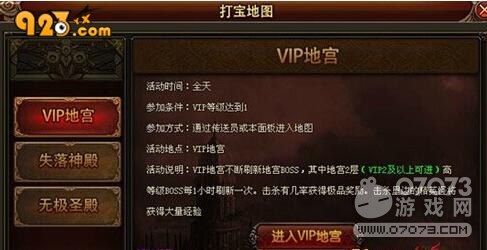 923yx《戰(zhàn)天》中的VIP地宮是一個(gè)專門為VIP玩家提供的特殊地圖,在界面右上方的打?qū)毜貓D中可點(diǎn)擊活動(dòng)詳情,只要是VIP1以上的玩家即可進(jìn)入。VIP神殿中包含了兩層,VIP1可進(jìn)入第一層,VIP2及以上玩家可進(jìn)入二層地圖。