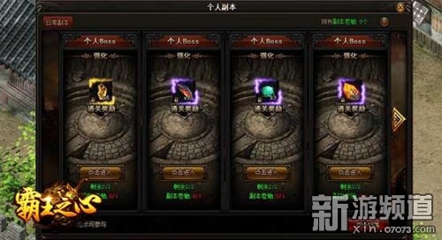 9cb《霸王之心》的個人副本共有六種,分別為護盾副本、羽毛副本、真氣副本、強化副本、暗器副本、魂石副本,在這六個副本中分別可獲得六種養(yǎng)成系統(tǒng)的所需材料。