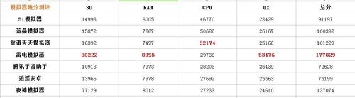 下面是各個模擬器的詳細評分情況,標紅的為各項最高分和總分??梢钥闯鲈?D模塊,雷電模擬器和夜神模擬器表現(xiàn)超群,其余的均在1萬分浮動,夜神模擬器達到了7萬分,而雷電模擬器更是高達8萬分。RAM模塊各家旗鼓相當,差距不大;CPU則是靠譜天天模擬器拿下第一,各家模擬器在CPU評分分為了兩個陣營,51、藍疊、靠譜的分數(shù)較高且較為接近,雷電、騰訊、逍遙、夜神較低也較為接近;UX評分則是雷電模擬器獨居一檔,達到五萬分,其余的都在兩萬分徘徊。