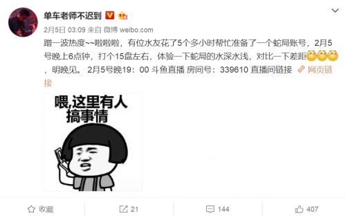 就連娛樂主播也發(fā)微博表示“查數(shù)據(jù)的網(wǎng)站這么多,打的是什么分段的局觀眾不一定清楚,自己心里沒點B數(shù)嗎”。這條微博還獲得了王校長的點贊,可見王校長也嘲笑了蛇哥的這次自證。