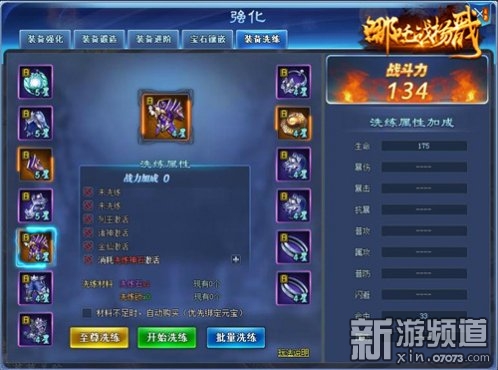 在裝備進(jìn)階到一定等級后可開啟一定數(shù)量的洗練槽,玩家可通過消耗洗練石對裝備進(jìn)行屬性洗練。屬性有品質(zhì)之分,品質(zhì)越高加成屬性越多。在洗練時(shí)玩家也可使用洗練鎖將高品質(zhì)的屬性鎖定,避免被再次洗練。每件裝備玩家也可通過消耗洗練神石激活一條額外的洗練槽。