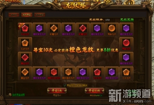 玩家可以通過消耗1個尋寶符來進行1次龍紋尋寶,單個尋寶符元寶價值為200元寶,10連抽則可享8折優(yōu)惠,且必出橙色龍紋,還是相當劃算的。此外每次龍紋尋寶都會獲得龍紋碎片,龍紋碎片也可用于兌換龍紋。除此之外,龍紋塔也是龍紋的重要產(chǎn)出地。