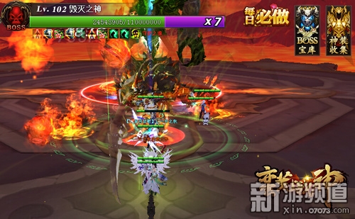 面對實力強(qiáng)大的毀滅之神,來自全服的蠻荒勇士熱血集結(jié),共同圍剿世界BOSS!玩家必須在15分鐘內(nèi)擊敗BOSS才能獲得獎勵,所以你需要與其他職業(yè)團(tuán)隊協(xié)作才能將其迅速擊殺,由戰(zhàn)士吸引BOSS仇恨,刺客和法師瘋狂輸出,祭祀配合為團(tuán)隊加血,保證團(tuán)隊的續(xù)航能力,只要擊殺BOSS就有機(jī)會獲得稀有橙裝掉落,趕緊加入戰(zhàn)斗吧!
