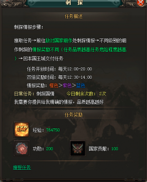 在2025年百變國戰(zhàn)網(wǎng)頁游戲《我在三國》中,每天12:30-14:00開啟雙倍刺探,70級及以上玩家可前往王城內(nèi)NPC刺探校尉處接受刺探任務(wù)。任務(wù)級別分為橙色、紫色、藍(lán)色三種級別。不同級別的細(xì)作刺探的情報獎勵不同(任務(wù)品質(zhì)越高危險程度也越高),領(lǐng)取任務(wù)后,根據(jù)任務(wù)提示前往敵對國家細(xì)作處刺探情報,找到并獲取情報以后?;氐奖緡醭翘幗桓度蝿?wù)。
