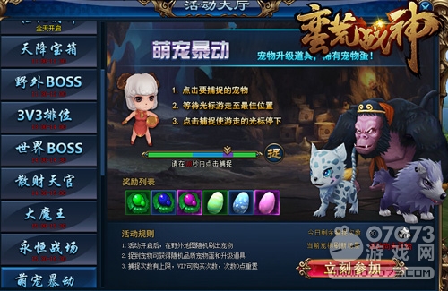 受到魔族氣息的影響,洪荒大陸上的異獸們開始暴動,在野外地圖將會隨機刷出寵物,只要捉到就能獲得隨機品質(zhì)的寵物蛋和升級道具,考驗眼力和手速的時刻到了!觀察捕捉條的移動規(guī)律,讓光標(biāo)停在最佳位置,就有機會獲得紫色神寵,讓你輕松點亮你的神寵圖鑒!