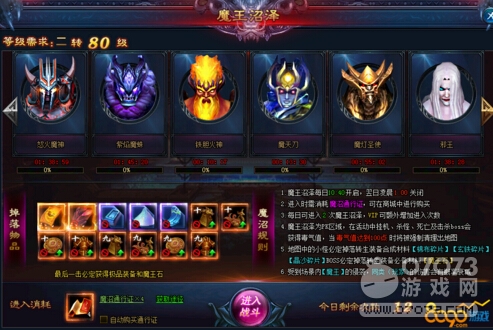 有這么一塊神秘之地,困難重重,環(huán)境惡劣,毒霧彌漫,缺蘊含著極大的財富,每天都有無數(shù)的探險者進(jìn)入,九死一生,為的就是尋找那個神秘而巨大的寶藏,這塊地圖名為——魔王沼澤。魔王沼澤每日10:40開啟,翌日凌晨1:00關(guān)閉,進(jìn)入時需要消耗魔沼通行證,可在商城中進(jìn)行購買。每天可進(jìn)入2次魔王沼澤,vip可額外增加進(jìn)入次數(shù)。