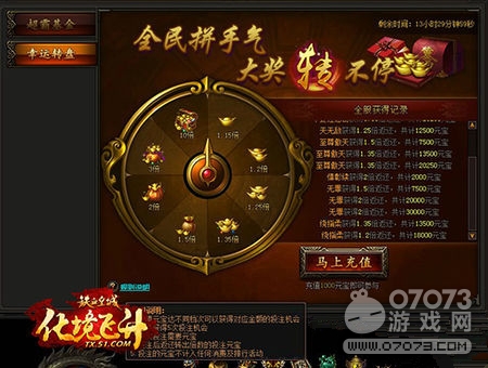 開(kāi)啟新服幸運(yùn)轉(zhuǎn)盤(pán),“大尺度”回饋玩家。新服玩家充值元寶達(dá)到不同檔次可獲得對(duì)應(yīng)金額的投注機(jī)會(huì),每人最多獲得5次投注機(jī)會(huì),每次投注需要一定數(shù)值的元寶,轉(zhuǎn)盤(pán)后會(huì)返還轉(zhuǎn)出倍數(shù)的投注元寶,投注的元寶不計(jì)入任何消費(fèi)和排行活動(dòng)。此次轉(zhuǎn)盤(pán)可是穩(wěn)賺不賠的游戲玩法,最低返還115%的元寶,最高能夠得到10倍的暴擊,完全不需猶豫,暴富就在今天。