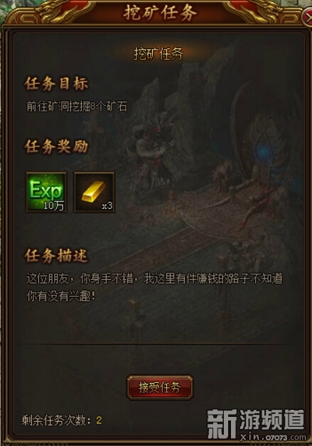 泡點出來走過路過的朋友千萬不要錯過,這里有條賺錢的路子不知道你有沒有興趣呢?那正是礦洞挖礦,這是獲得大量金幣的主要來源。玩家可以通過武城的礦主進入礦洞進行挖礦,完成礦主任務即可獲得經驗和金幣獎勵。進入礦洞時必須攜帶鶴嘴鋤,接受礦洞任務時如果身上沒有鶴嘴鋤會自動提示購買并裝備。玩家可以一邊挖礦一邊出售礦石,獲得大量金幣。