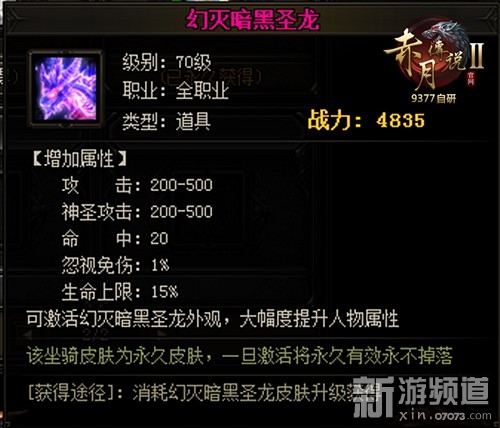 玩家在游戲里佩戴9377《赤月傳說2》幻滅暗黑圣龍可激活對應(yīng)外觀,并大幅度提升人物屬性,且該坐騎皮膚為永 久皮膚,一旦激活將一直有效不會掉落。