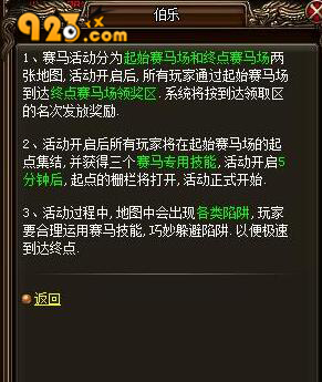 923yx《烈火戰(zhàn)神》中的賽馬活動在每天的15:30-16:00時開啟,與NPC伯樂對話即可參與活動。賽馬活動分為起始賽馬場和終點賽馬場兩張地圖,活動開始后,系統(tǒng)將按照大家通過起始賽馬場達(dá)到終點賽馬場領(lǐng)獎區(qū)的名次發(fā)放獎勵。獎勵中,除了有經(jīng)驗值和金幣外,還有大量珍貴道具哦!