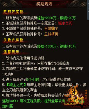 勝利方所有參與的幫派成員獲得經(jīng)驗(yàn)銅錢(qián)獎(jiǎng)勵(lì)。城主獲得特殊唯一專(zhuān)屬武器“城主之刃”、特殊稱(chēng)號(hào)“王城霸主”。王幫成員獲得稱(chēng)號(hào)“王城精英”。失敗方所有參與的幫派成員也可以獲得經(jīng)驗(yàn)銅錢(qián)獎(jiǎng)勵(lì)。