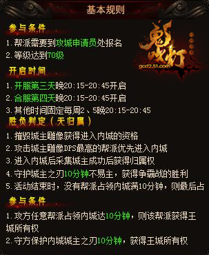 51《鬼吹燈之牧野詭事》王城爭(zhēng)霸戰(zhàn)在開(kāi)服第三天晚20:15-20:45開(kāi)啟;合服第四天晚20:15-20:45開(kāi)啟;其他時(shí)間固定每周2、5晚20:15-20:45開(kāi)啟,幫派需要到攻城申請(qǐng)員報(bào)名,成員等級(jí)達(dá)到70級(jí)即可參加。摧毀城主雕像獲得進(jìn)入內(nèi)城的資格,攻擊城主雕像DPS最高的幫派優(yōu)先進(jìn)入內(nèi)城,進(jìn)入內(nèi)城后采集城主成功后獲得歸屬權(quán),守護(hù)城主之刃10分鐘不易主,獲得爭(zhēng)霸戰(zhàn)的勝利!