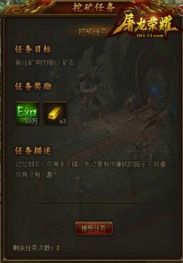 泡點(diǎn)出來走過路過的朋友千萬不要錯過,這里有條賺錢的路子不知道你有沒有興趣呢?那正是礦洞挖礦,這是獲得大量金幣的主要來源。玩家可以通過武城的礦主進(jìn)入礦洞進(jìn)行挖礦,完成礦主任務(wù)即可獲得經(jīng)驗(yàn)和金幣獎勵。進(jìn)入礦洞時(shí)必須攜帶鶴嘴鋤,接受礦洞任務(wù)時(shí)如果身上沒有鶴嘴鋤會自動提示購買并裝備。玩家可以一邊挖礦一邊出售礦石,獲得大量金幣。