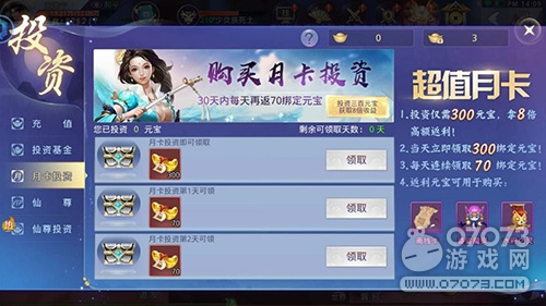 《莽荒紀(jì)2025》超值月卡投資!只需要投資300元寶,就可以拿到8倍的高額返利,為什么說是8倍呢?在道友們投資的當(dāng)天即可立即領(lǐng)取300綁定元寶!并且在之后的一個(gè)月內(nèi),玩家每天都可以連續(xù)領(lǐng)取到70綁定元寶,一共2400元寶!我的天吶,簡(jiǎn)直不能再劃算了!